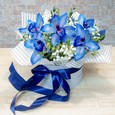 Синий букет хризантем, орхидей и гипсофилы
