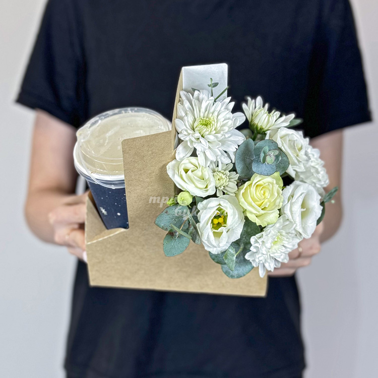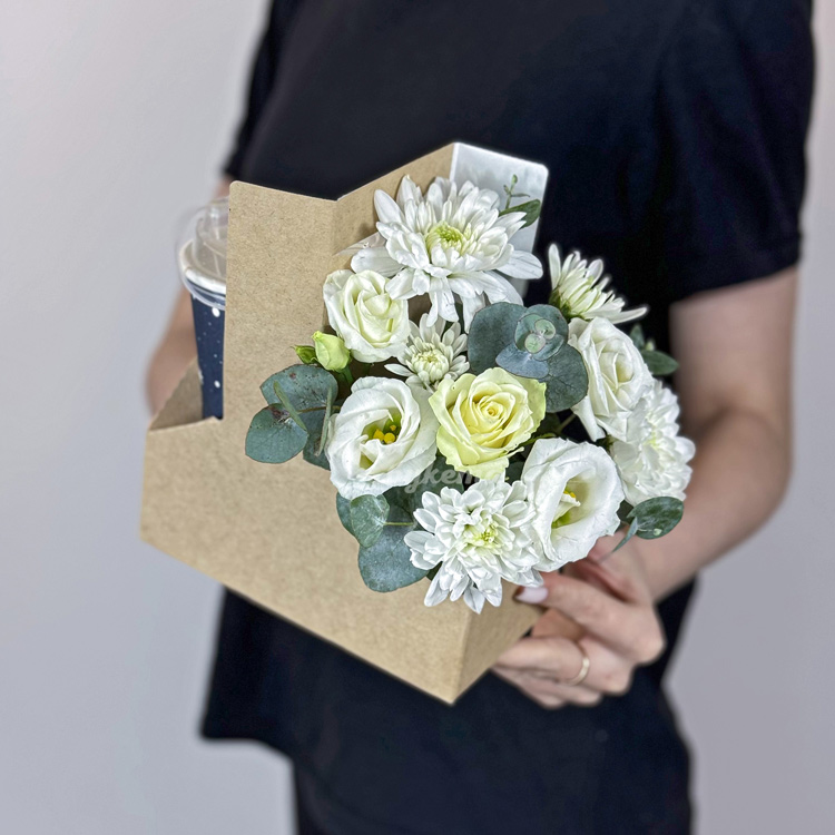 Бокс с кофе и белыми хризантемами