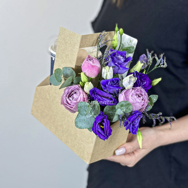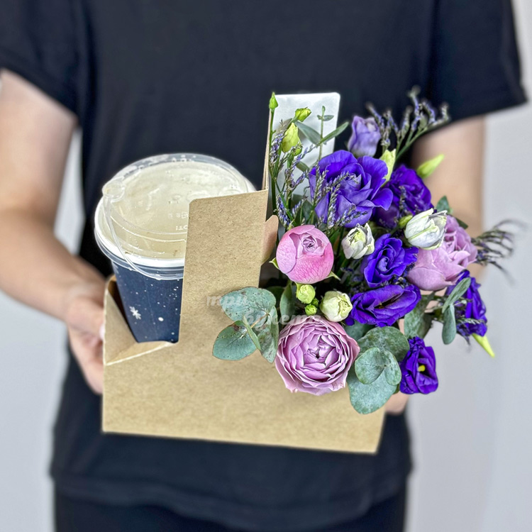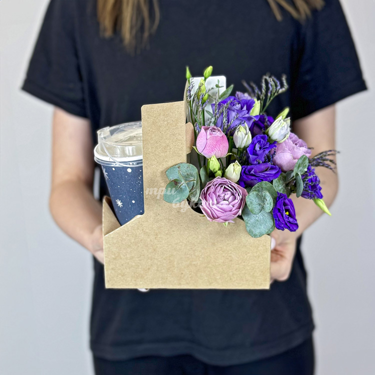 Бокс с кофе и фиолетовыми эустомами