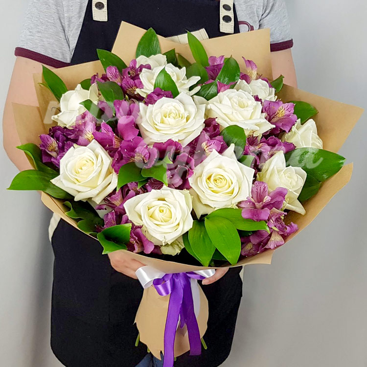 Букет из белых роз и альстромерий