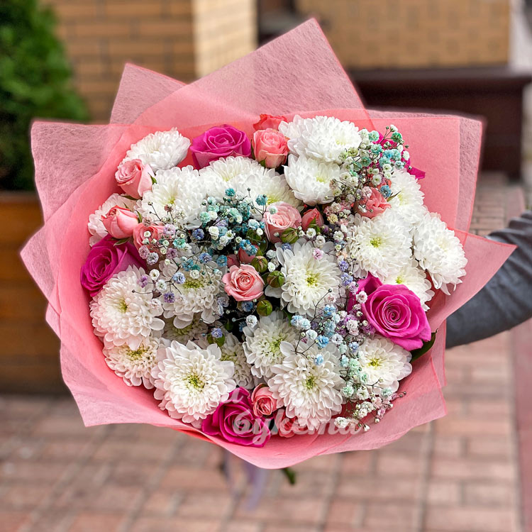 Букет из хризантем, роз и гипсофилы
