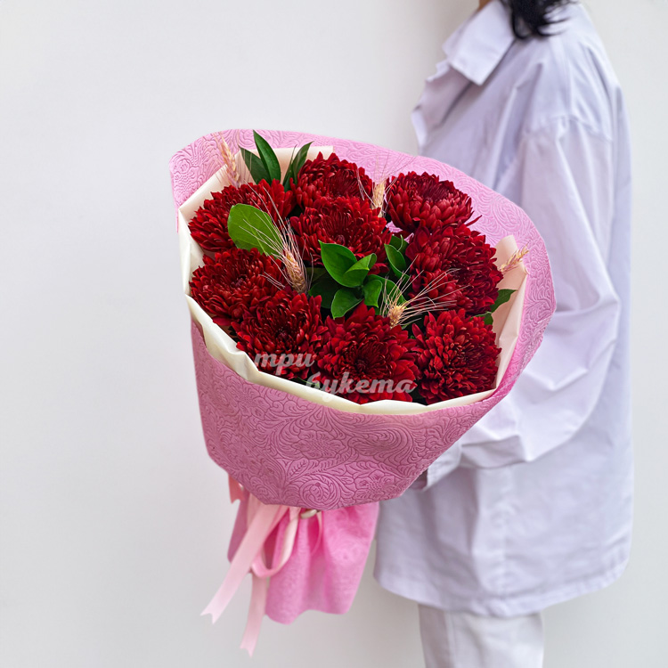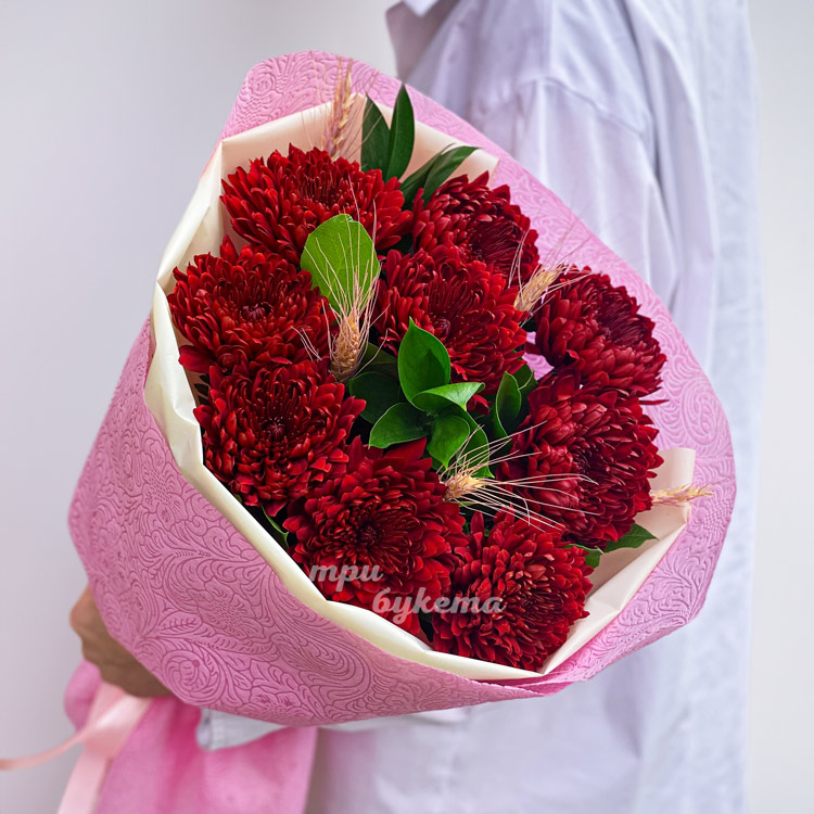 Букет из красных хризантем и зелени