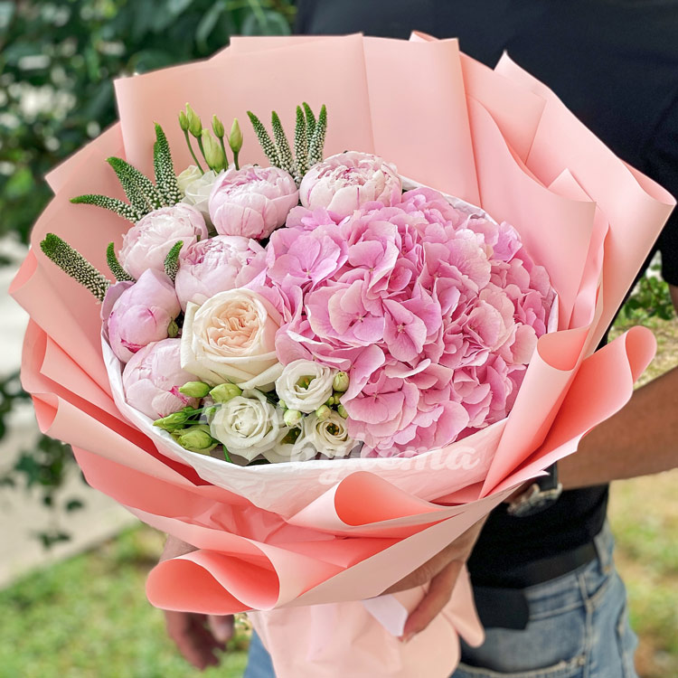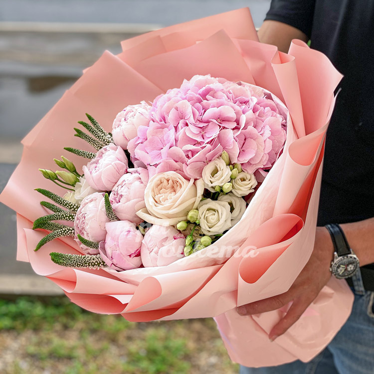 Букет из розовой гортензии и пионов