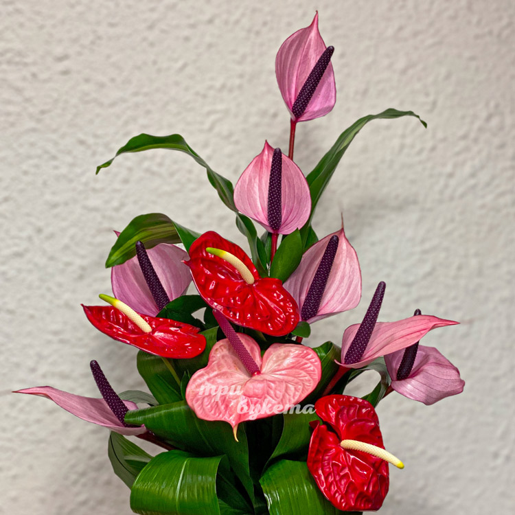 Букет из розовых и красных антуриумов