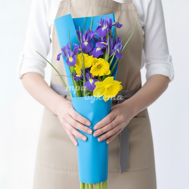 Букет из синих ирисов и нарциссов