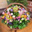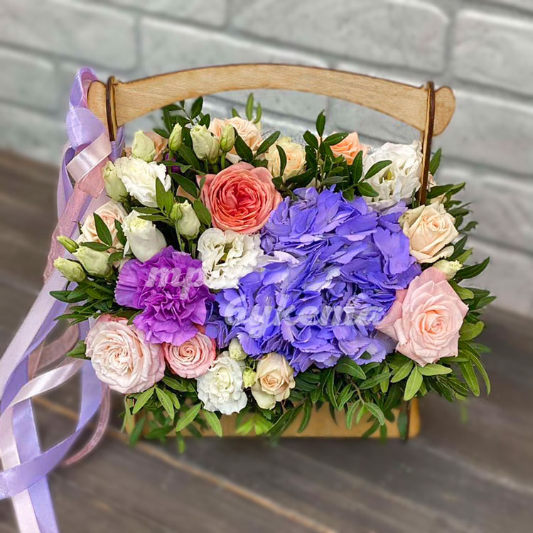 Гортензия, эустомы и розы в ящичке
