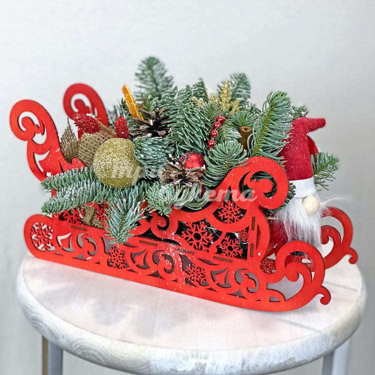 Хвойные ветки и украшения в санках