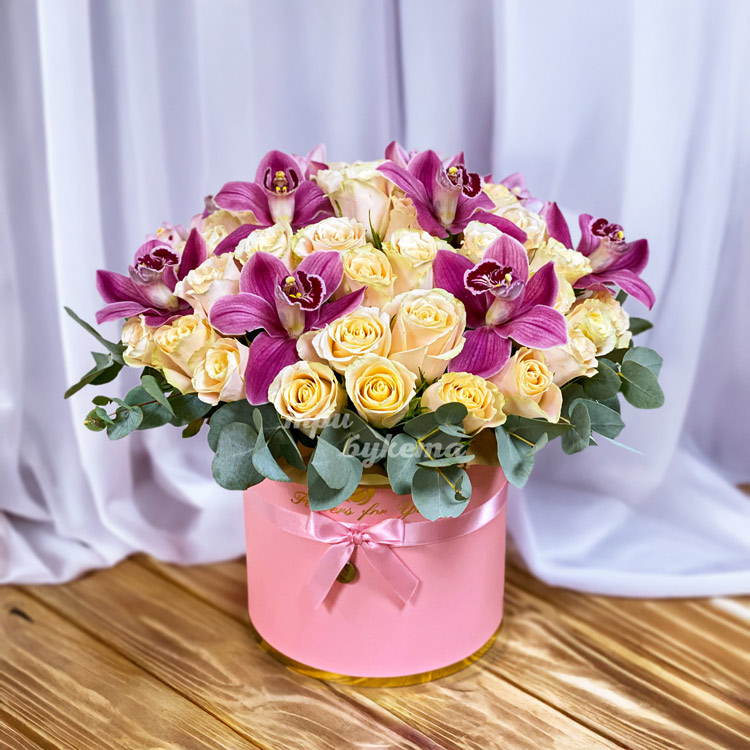 Коробка кремовых роз и бордовых орхидей