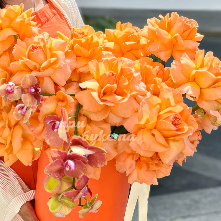 Коробка оранжевых роз с орхидеями