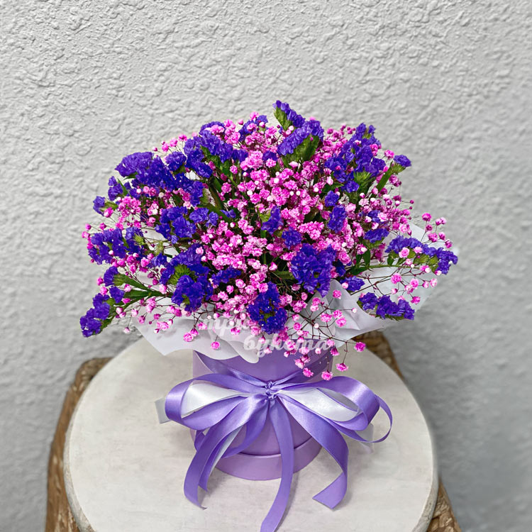 Коробочка с розовой гипсофилой и статицей