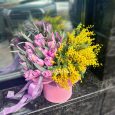 Красные розы и желтые орхидеи в ящичке