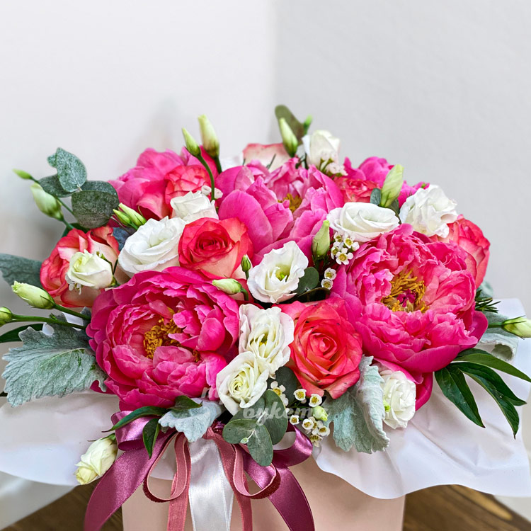 Пионы и розы в шляпной коробке