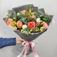 Розовые розы и персиковые диантусы в букете