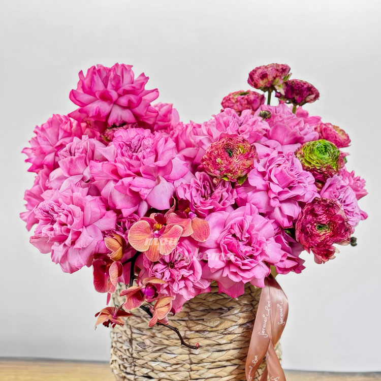 Ярко-розовые французские розы в кашпо